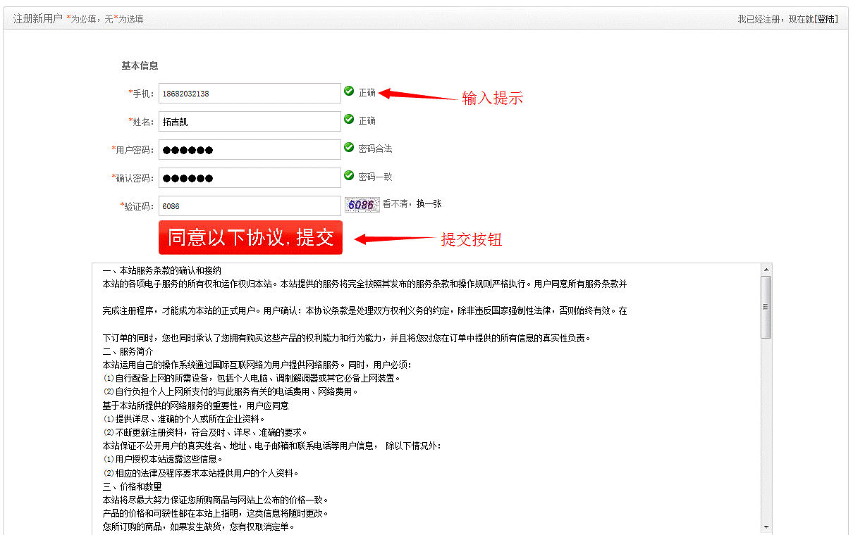 點擊注冊鏈接,跳轉(zhuǎn)到注冊資料錄入頁面。在這個頁面輸入您的手機號碼,姓名,密碼和系統(tǒng)驗證碼,每個輸入項系統(tǒng)都會進行校驗,如果輸入不合法,系統(tǒng)會在輸入項右側(cè)給出輸入錯誤原因提示。如果輸入正確,右側(cè)會顯示綠色背景的小鉤。在所有輸入項都正確輸入后,點擊最下方的提交按鈕即可完成注冊。如下圖: